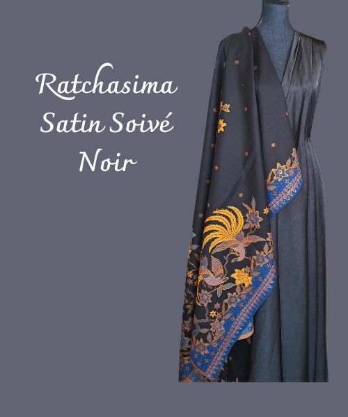 Avec le modèle "Ratchasima", je vous propose une association d'une couleur unie noire en satin soivé, doux et soyeux,  pour apporter plus de légèreté à cette "Veste Kimono", que je confectionnerai à votre taille.